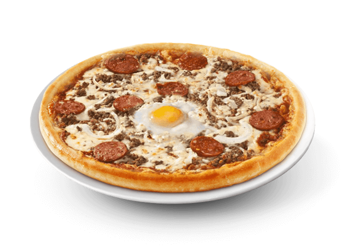 Tomate, fromage, viande hachée, chorizo, olives, oeuf.