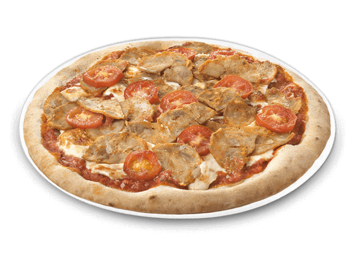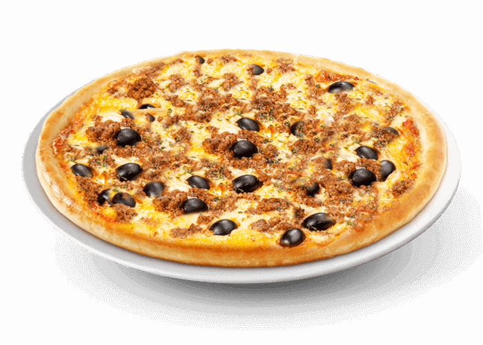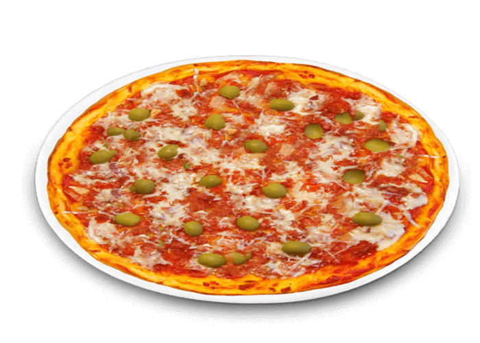 Tomate, fromage, viande hachée, merguez, poulet, olives.