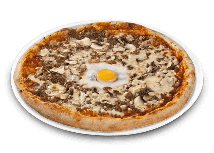Tomate, fromage, viande hachée, champignons, oeuf.