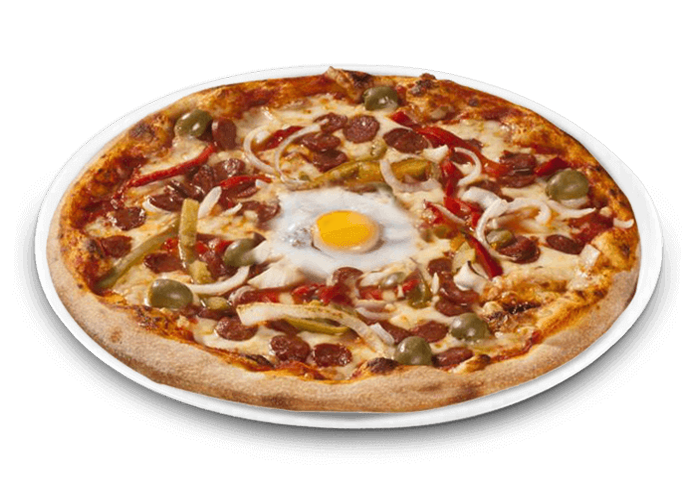 Tomate, fromage, merguez, poivrons, oignons, oeuf, olives.