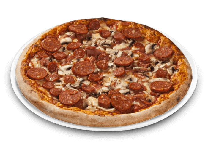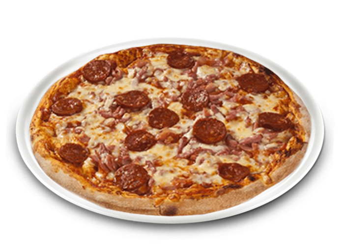 Tomate, fromage, lardons, jambon, chorizo, pepperoni.